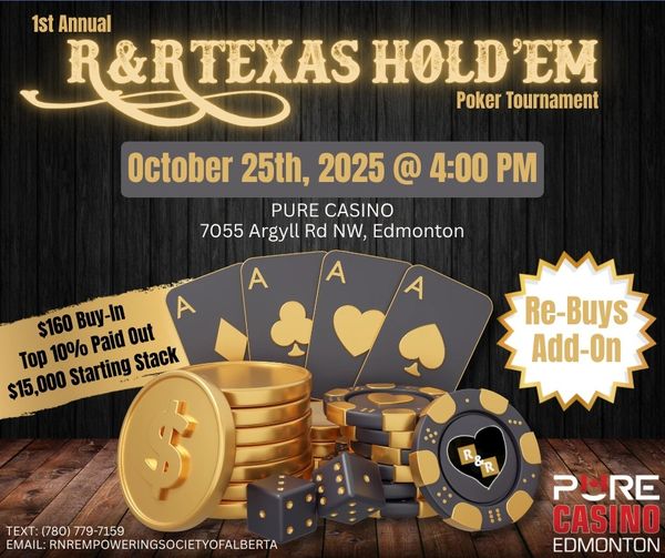 Shuffle up and deal—for a cause that matters! Join us at Pure Casino Edmonton (7055 Argyll Rd NW) for the 1st Annual R&R Texas Hold ’Em Poker Tournament on October 25th. This fundraiser supports R&R youth programs, with 50% of the pot going to the top 10% of entrants and the other 50% helping us empower kids through sport, mentorship, and connection. Enjoy prizes, drinks, and bragging rights all night long!